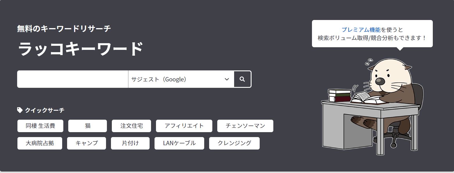 サジェストワードを探すには無料サービスである「ラッコキーワード」がおすすめです。