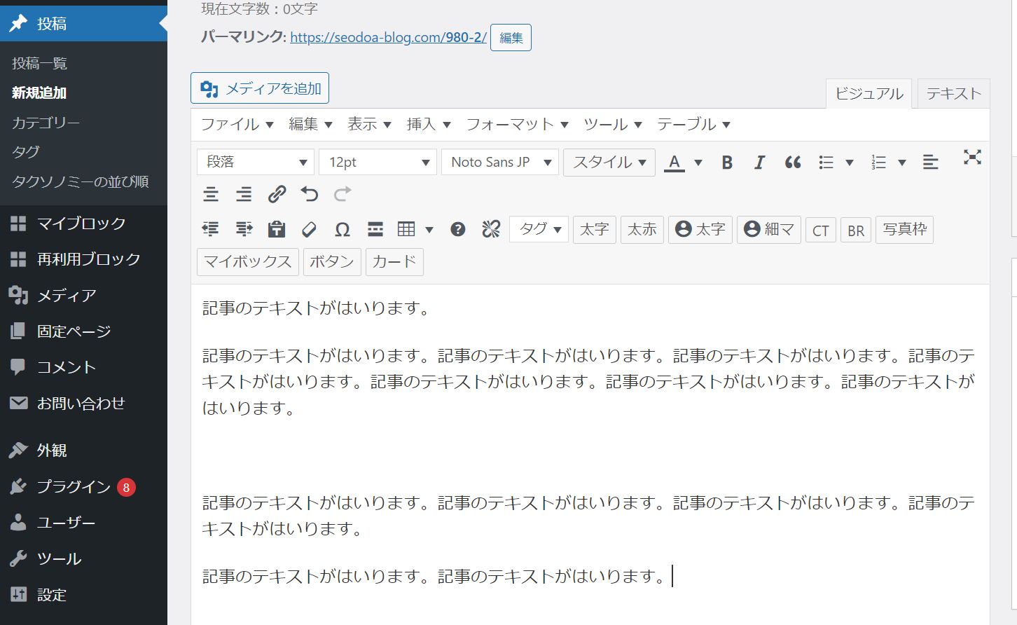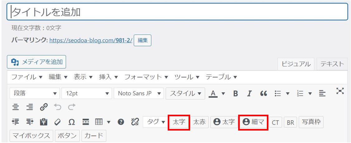 装飾によっては、このエディターでは表示されず、実際のページでしか表示されないものもありますので、ちょくちょく下書きを更新してエディター上部のパーマリンクからどのように表示されるか確認しましょう。