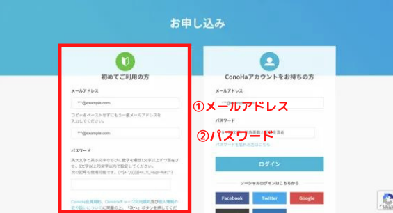 左側の『初めてご利用の方』にメールアドレスとパスワードを入力します。