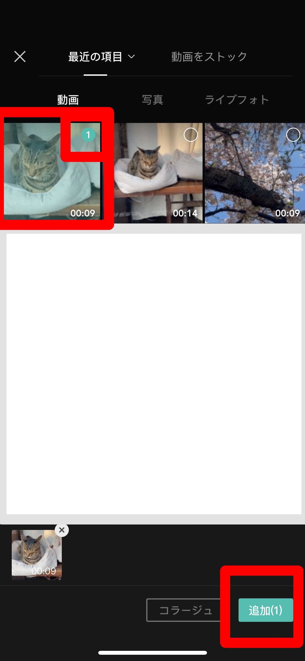 するとスマホ内にある動画や写真を選択する画面に切り替わります。