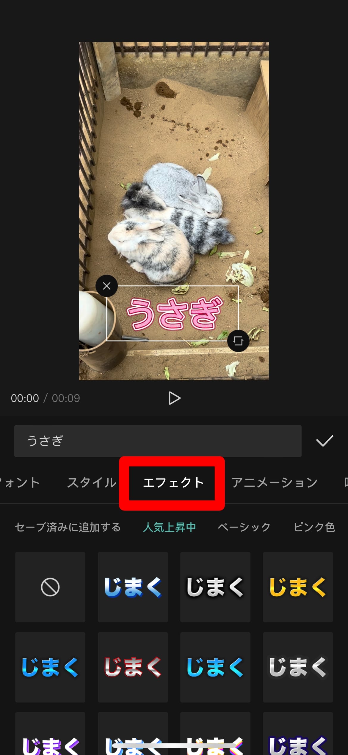 もし、ささっと『派手な文字』や『可愛い文字』に変更するならエフェクト内にテンプレートとしてある文字に設定するのがおすすめです。
