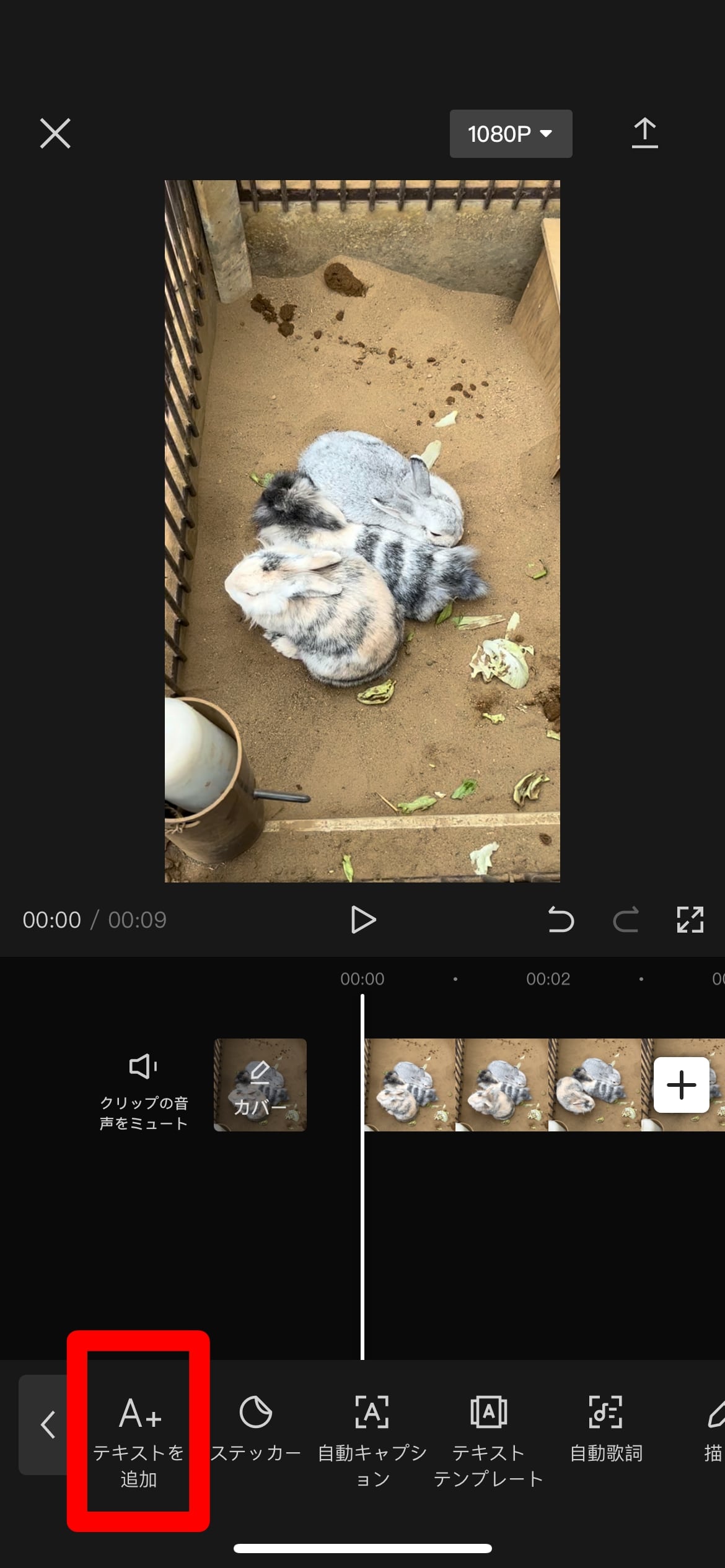 下部のメニューの「テキスト」から「テキストを追加」を選択します。