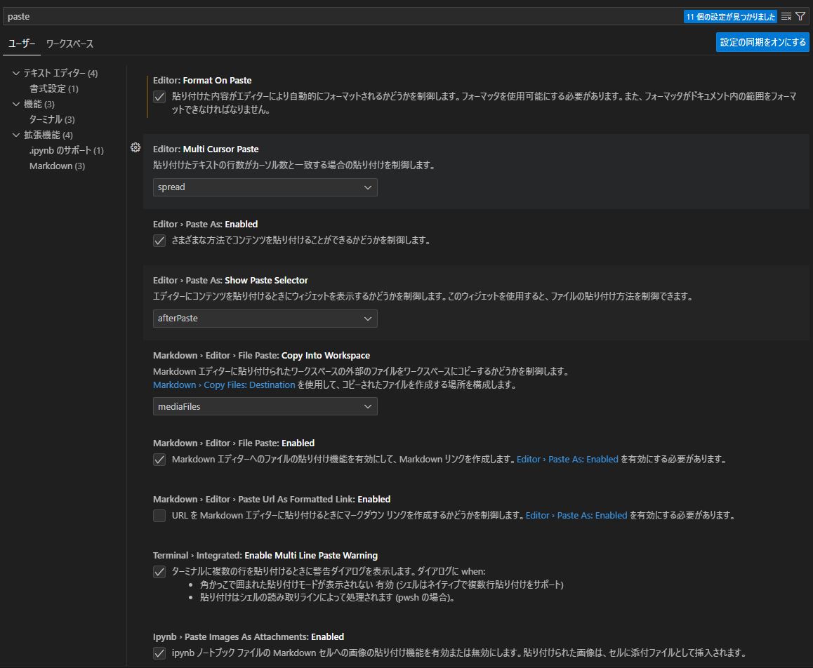 ファイル>ユーザ設定>設定>設定の検索欄に「paste」で検索